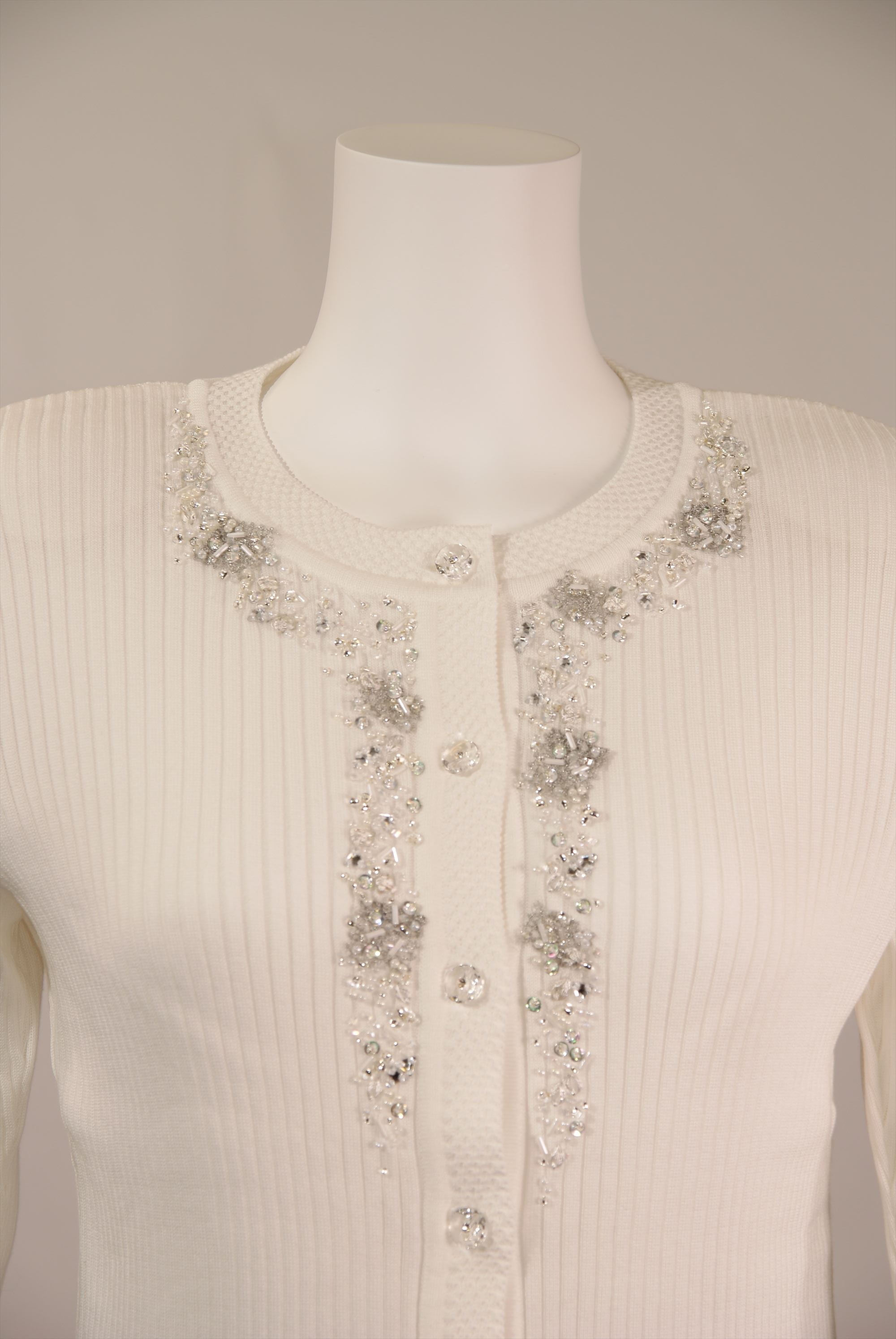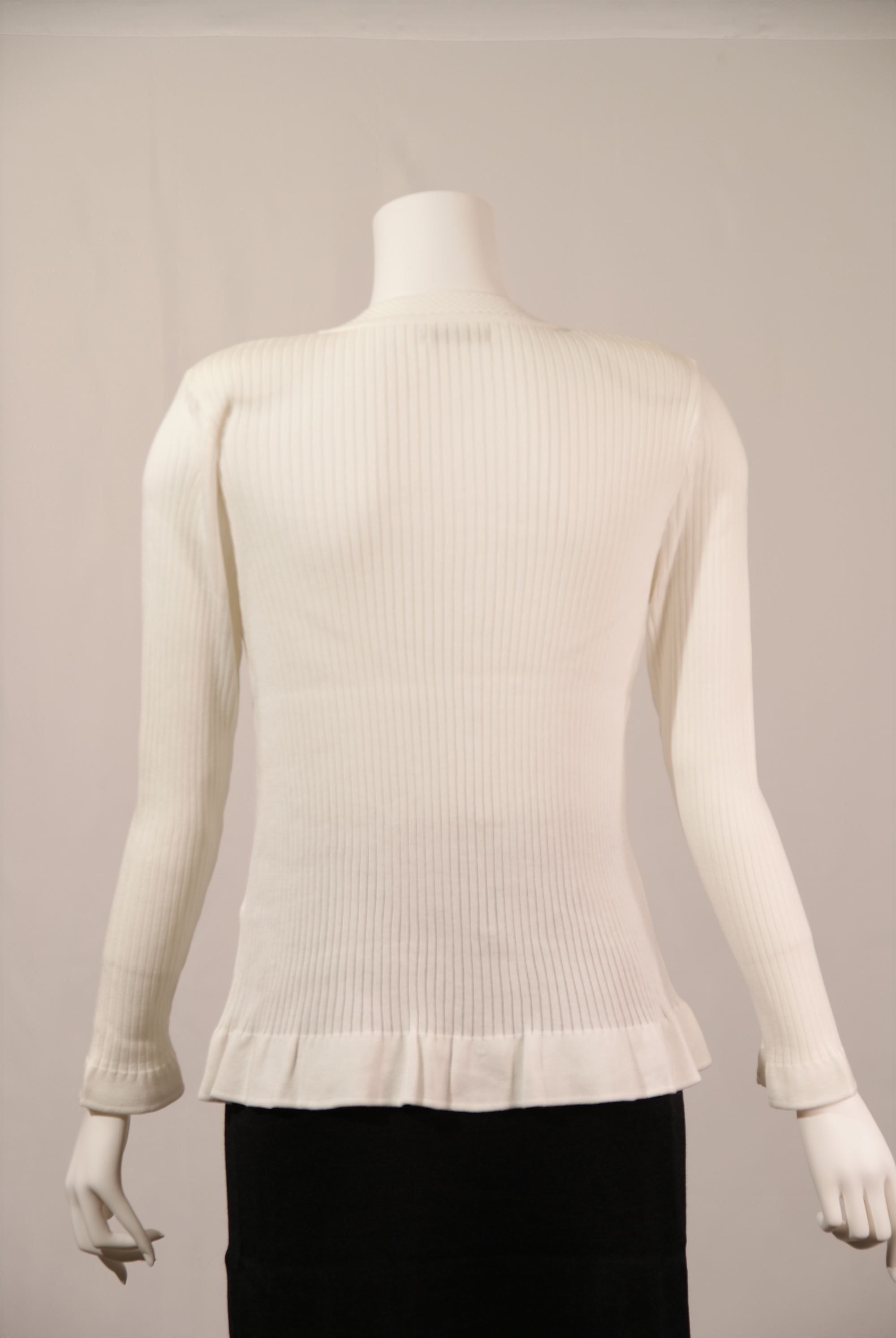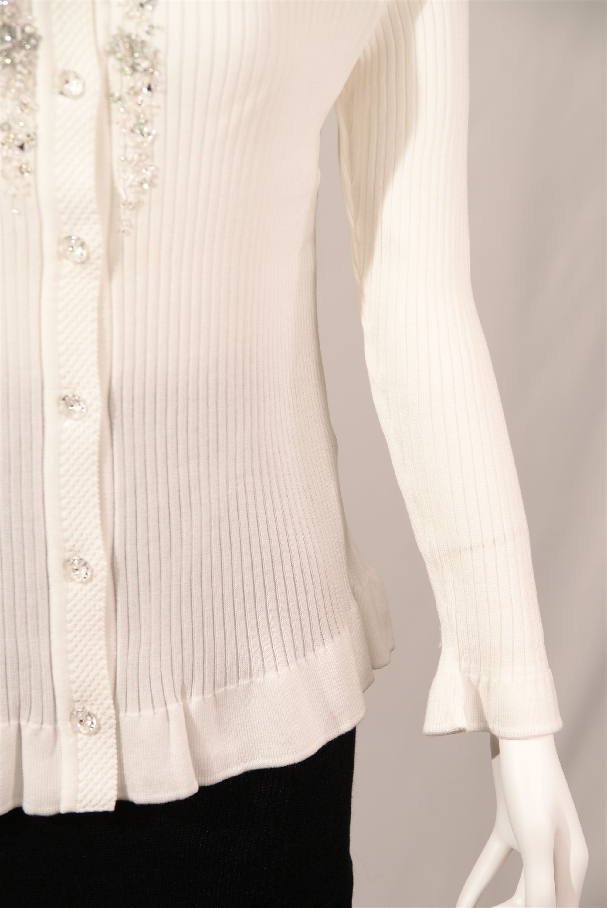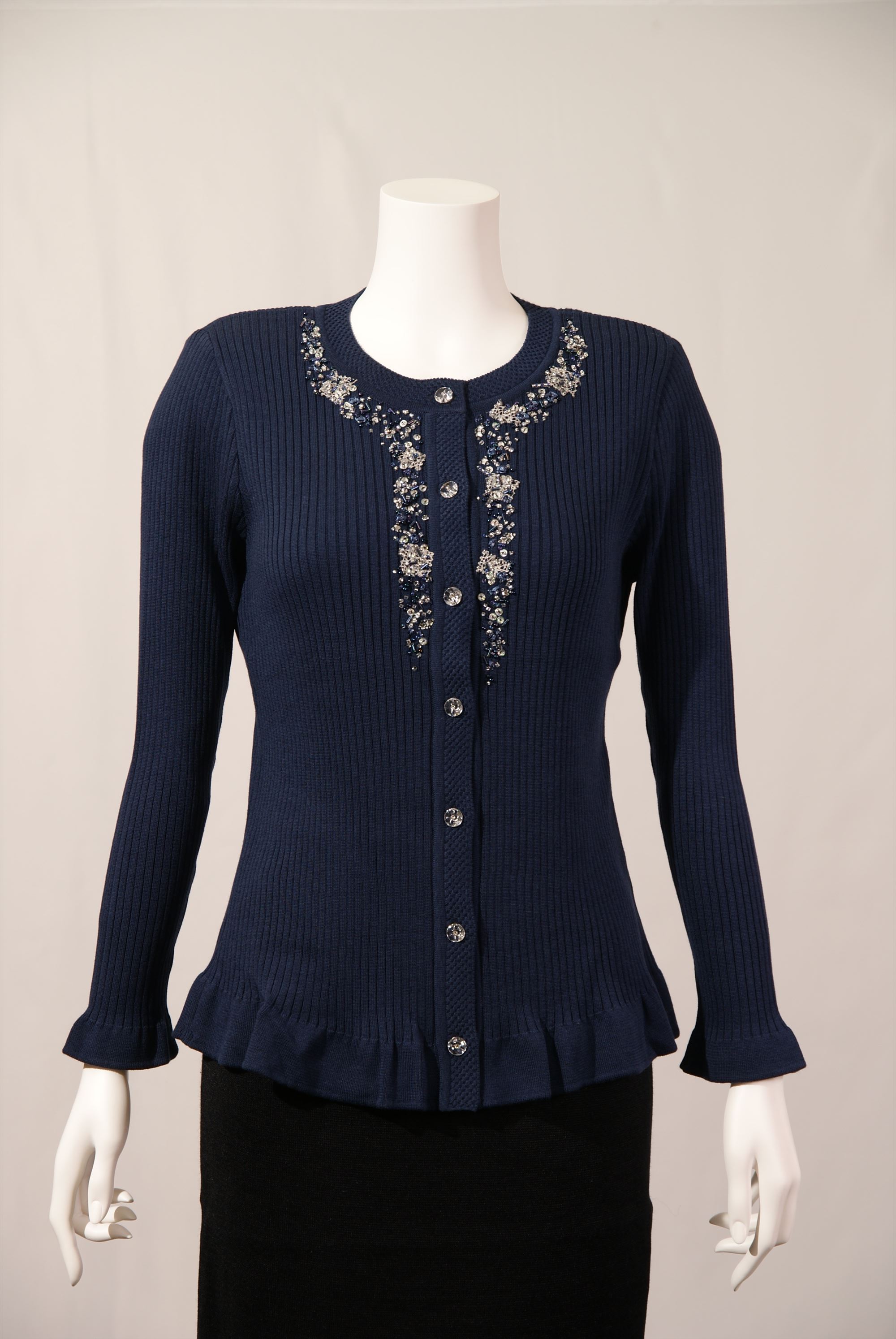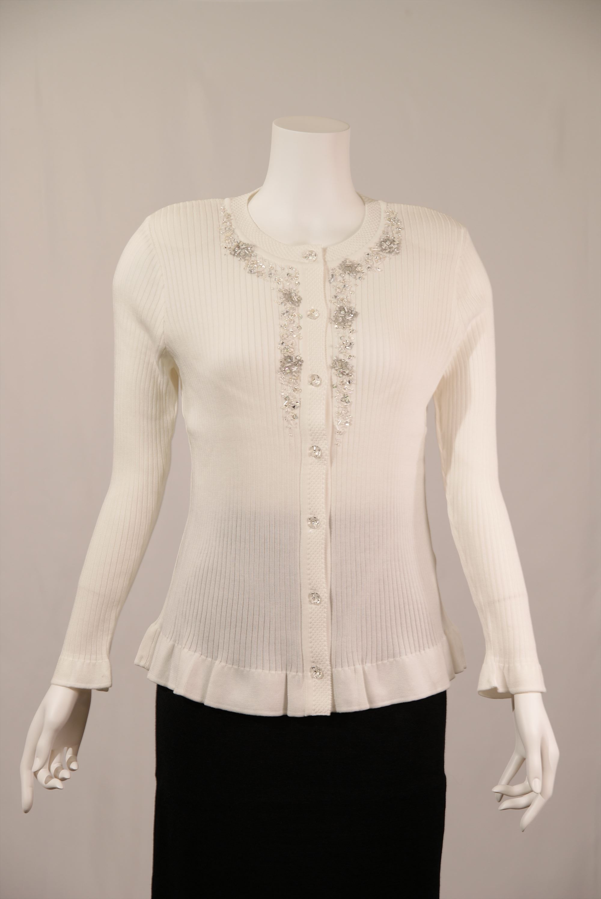調湿機能に優れ、季節問わず快適な着心地を得られる綿混素材を使用したリブ編みとフリル使いのニットセーターです。全体に入ったリブ編みが縦ラインを強調しスタイル良く見せてくれます。衿まわりと前立ての繊細なビーズ刺繍が華やかな一着です。