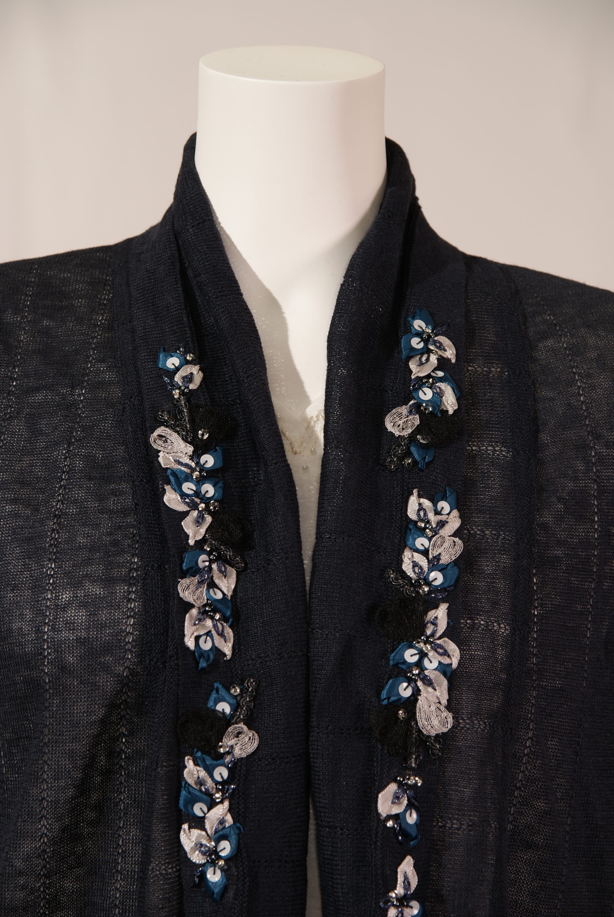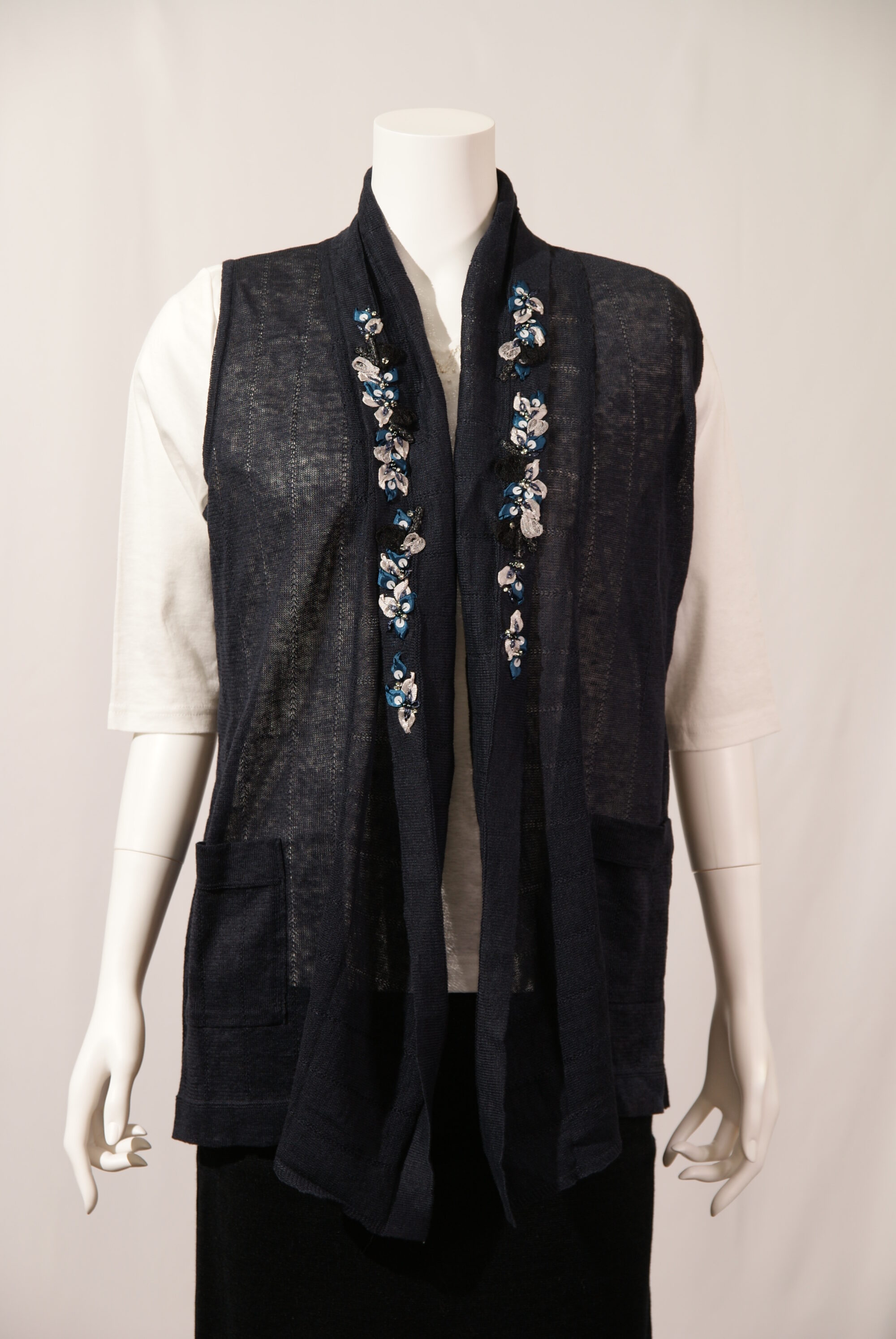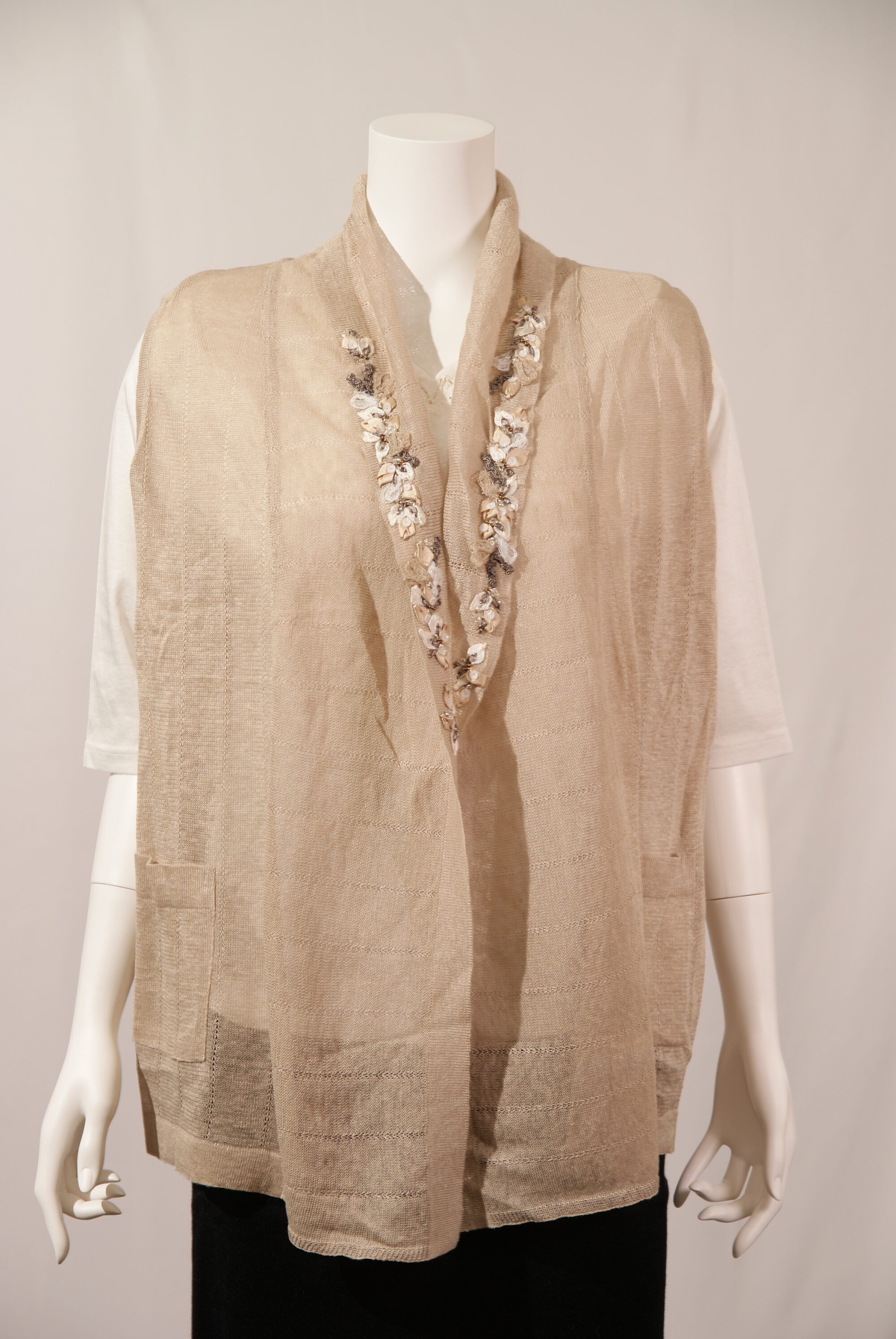 高級天然素材のリネン麻を使用したニットジレです。ナチュラルな色合いでまとめた小花刺繍をドレープ衿に施しました。肌寒いときに気軽に羽織れ、気になる腰回りをカバーしてくれます。