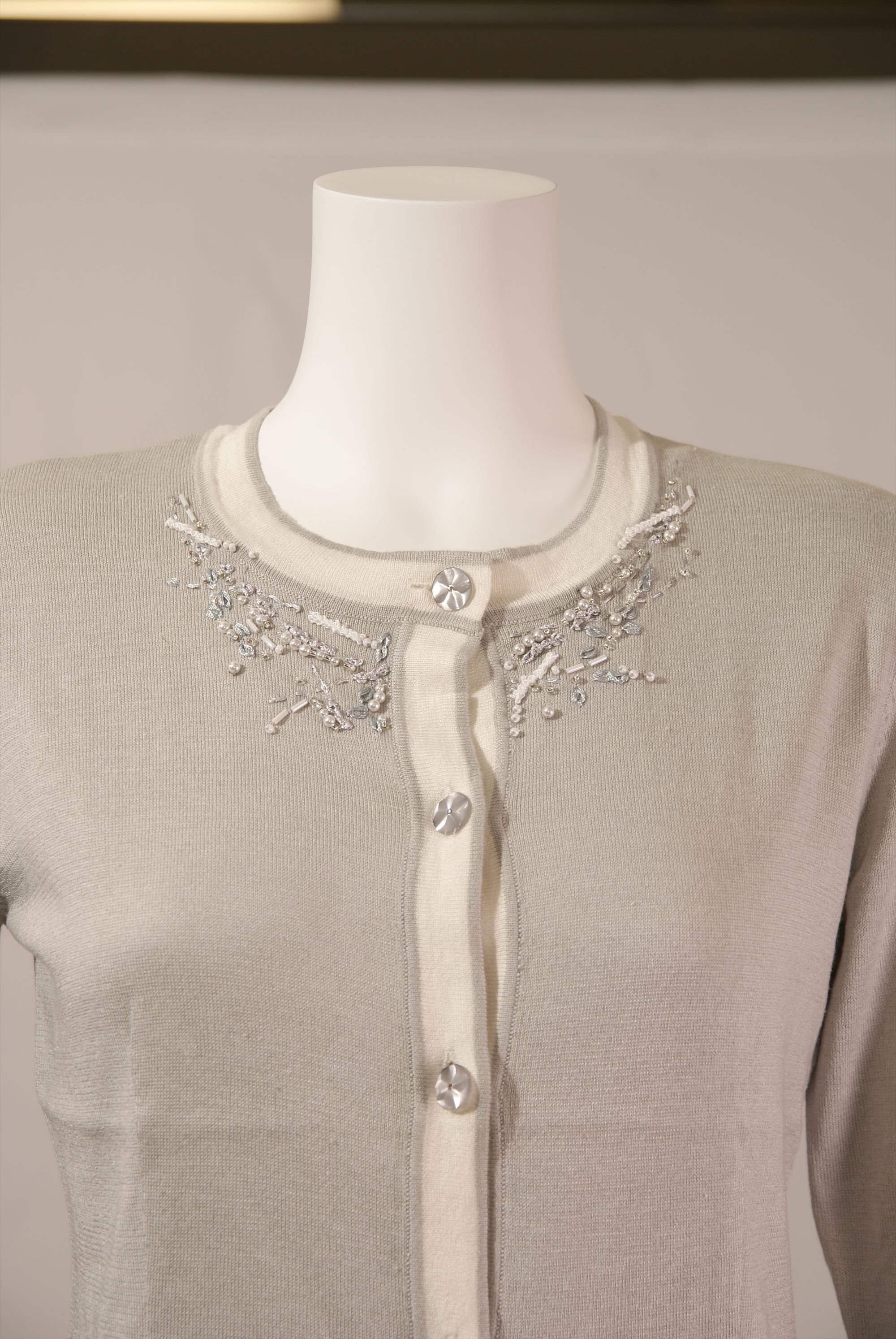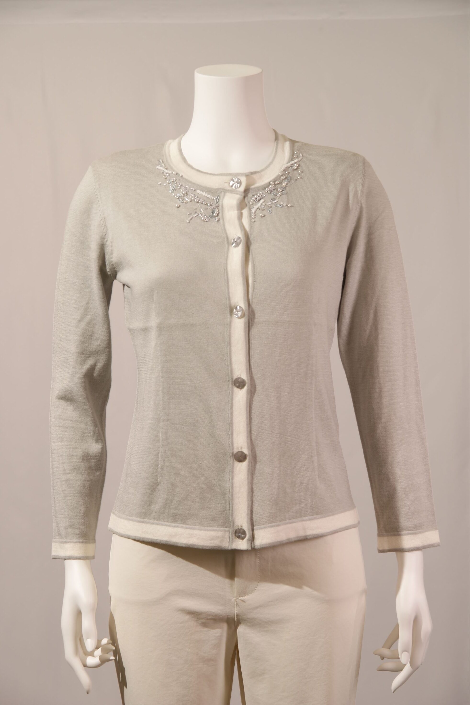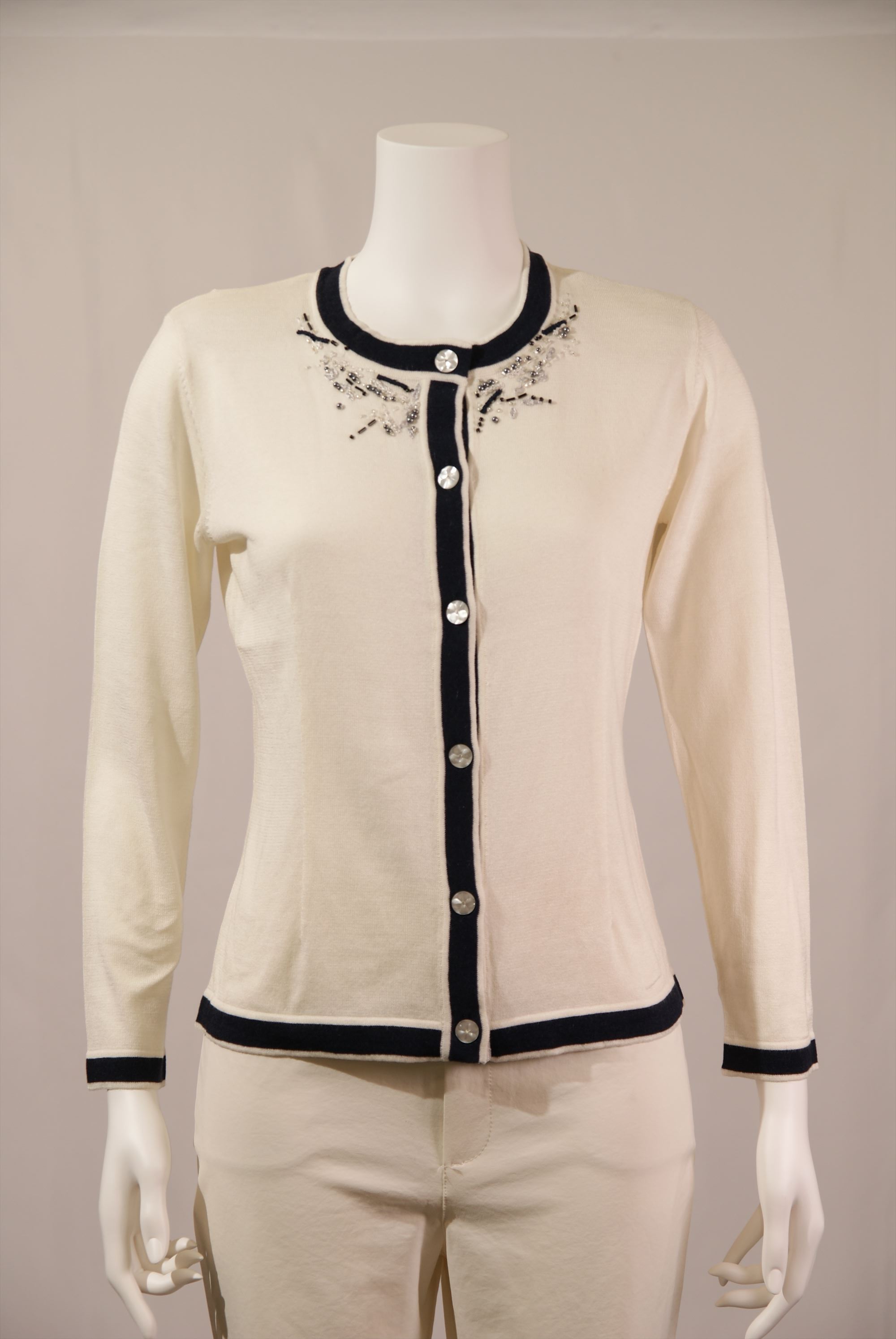 シルク綿天竺 丸首配色カーディガン×衿ビーズ刺繍(#110240とアンサンブル可能)