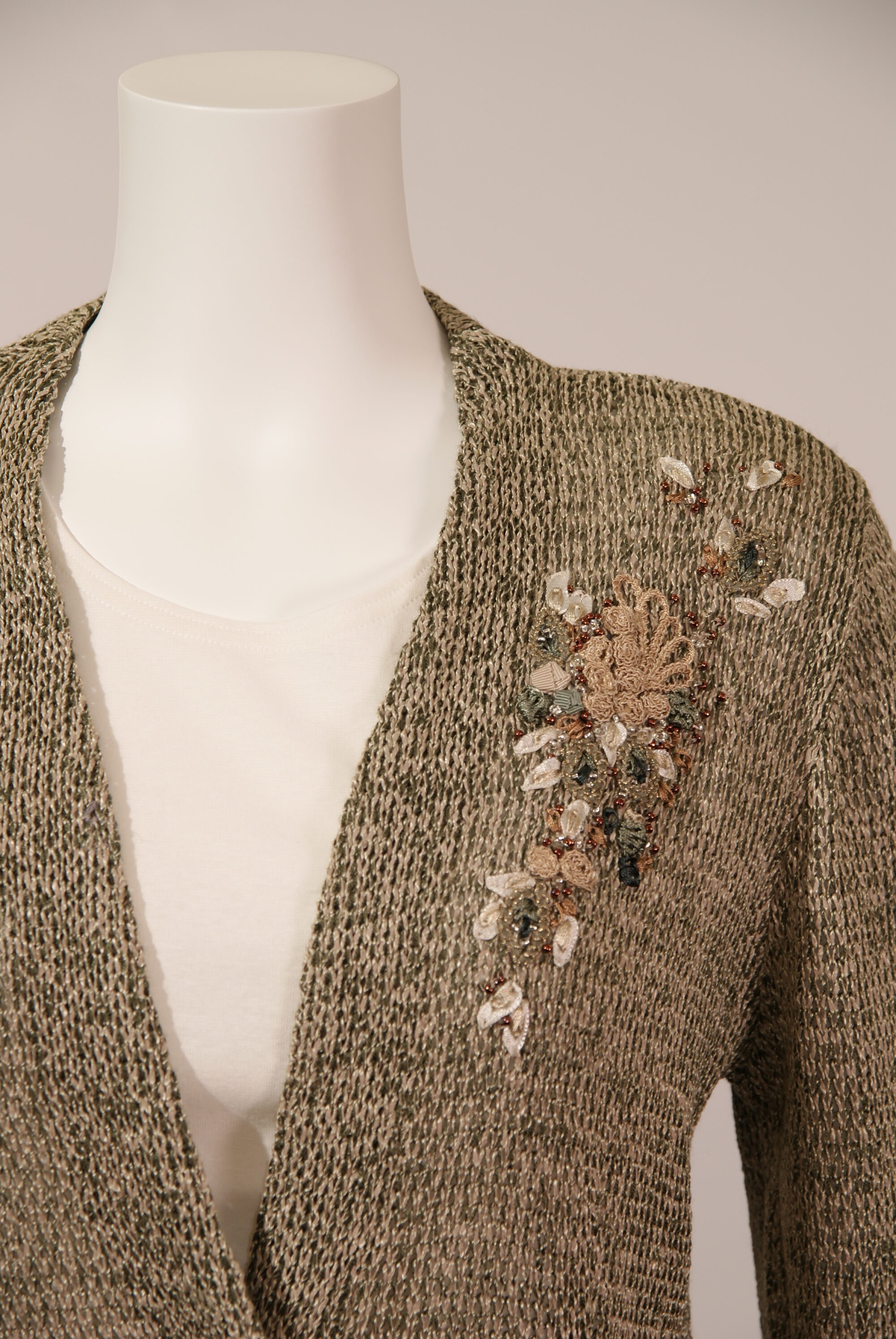 シャリ感・清涼感があり、通気性・吸収性にも優れた抄繊糸を使用したニットカーディガンです。優しいメランジカラーに幾何学柄の刺繍を施しました。