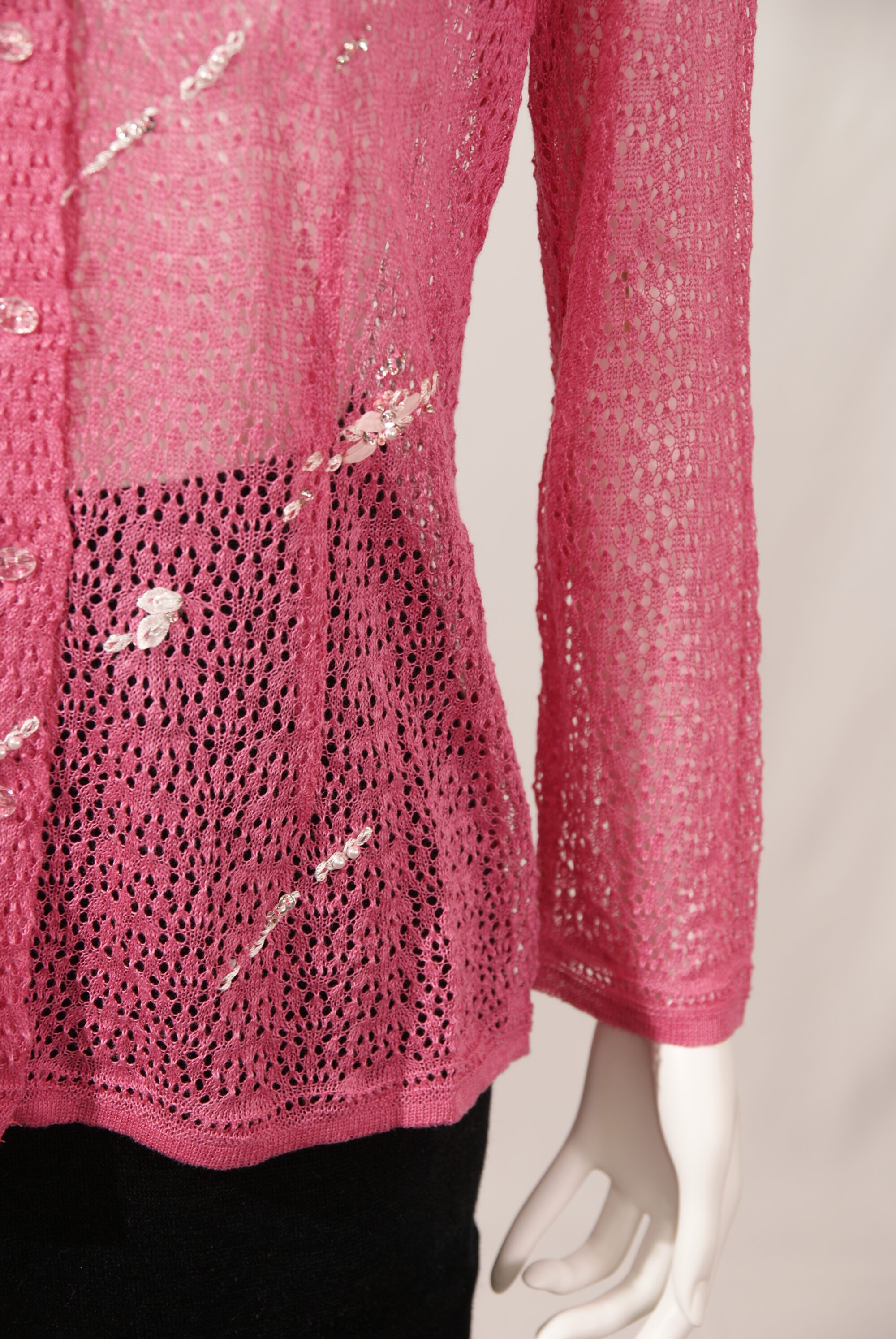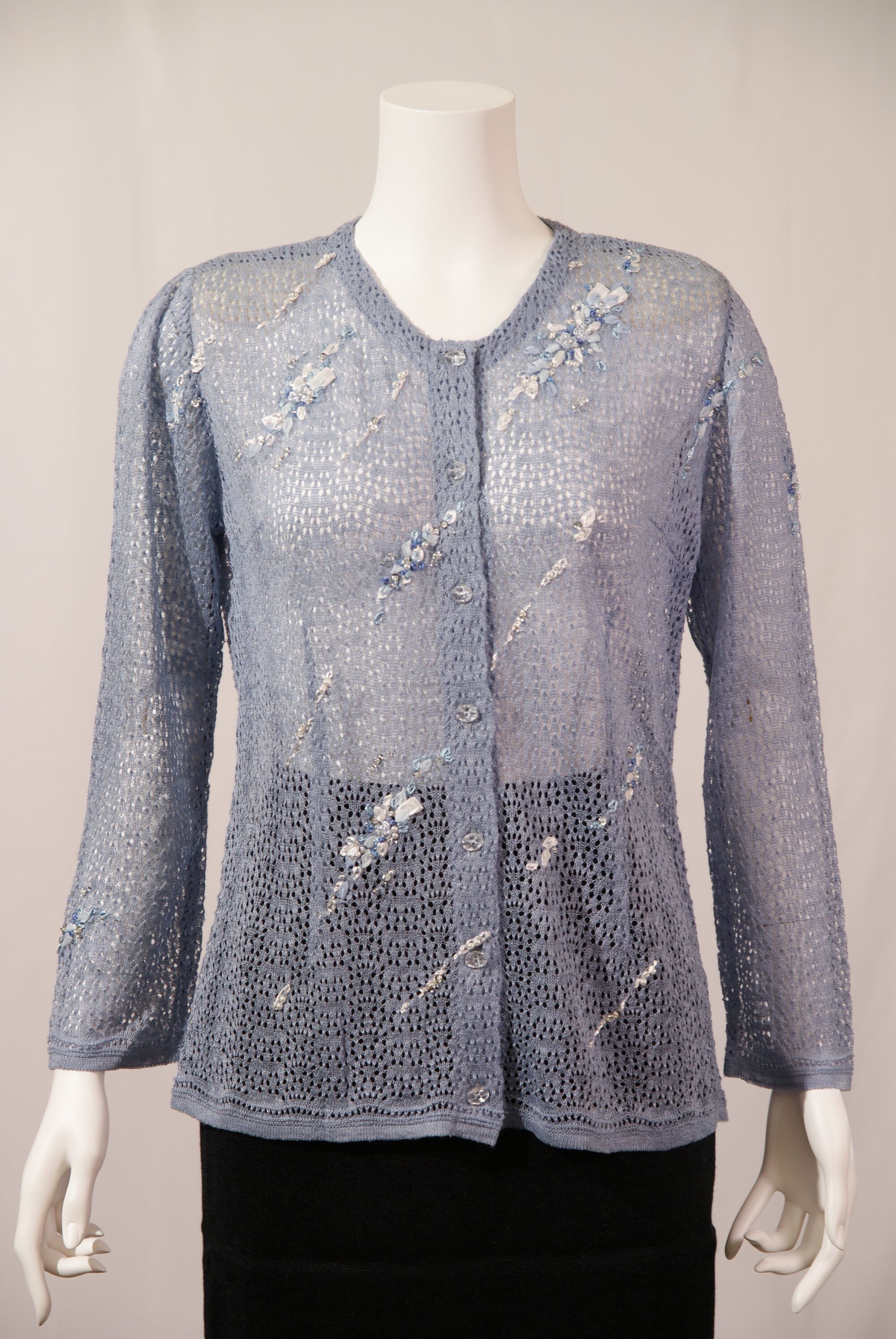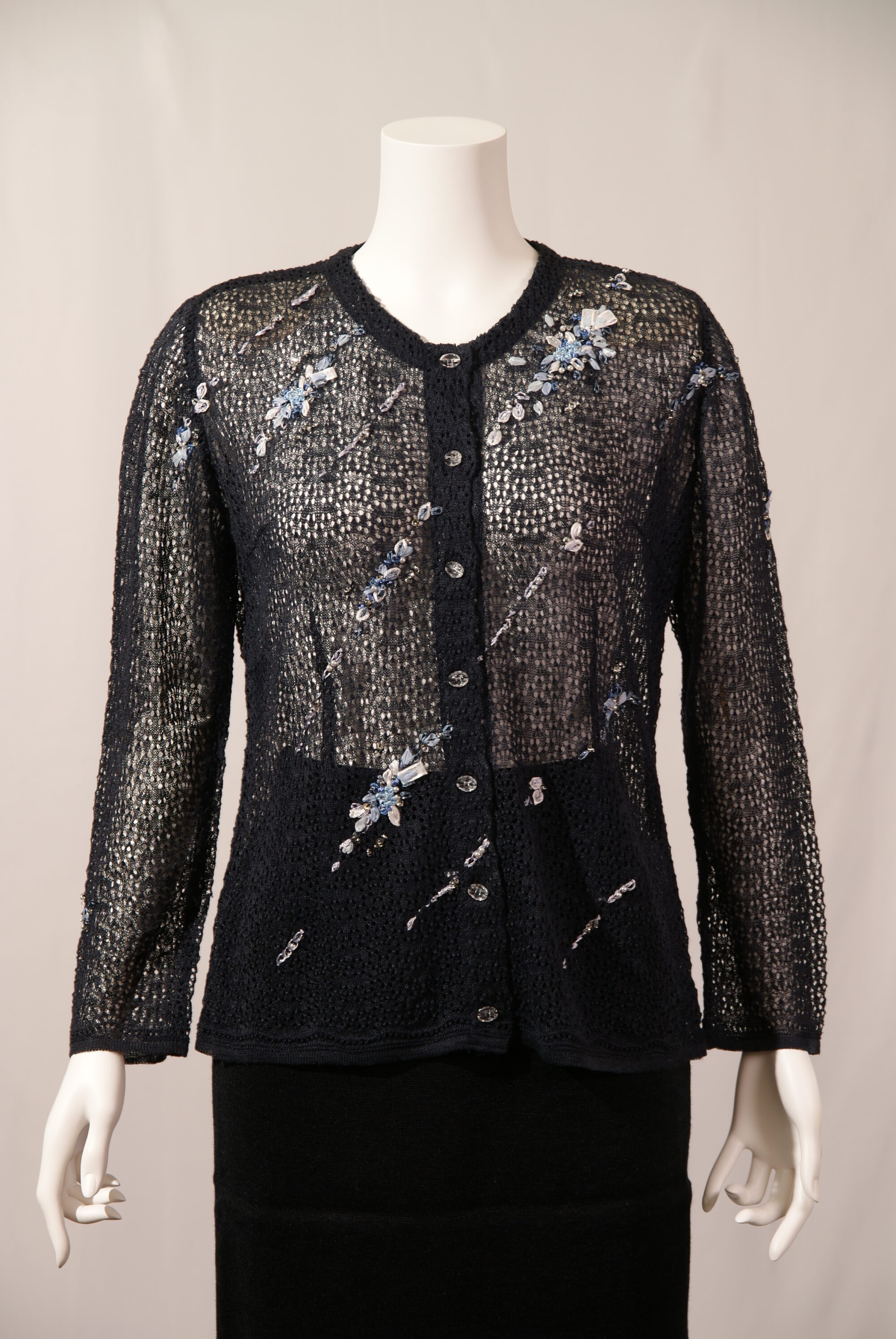 高級天然素材のリネン麻を使用したニットカーディガンです。サガンオリジナルの繊細なスカシ柄にかぎ針の花モチーフやビーズを使用した繊細な刺繍が星の様に流れる上品な一着です。(#120120とセットアップ可能)