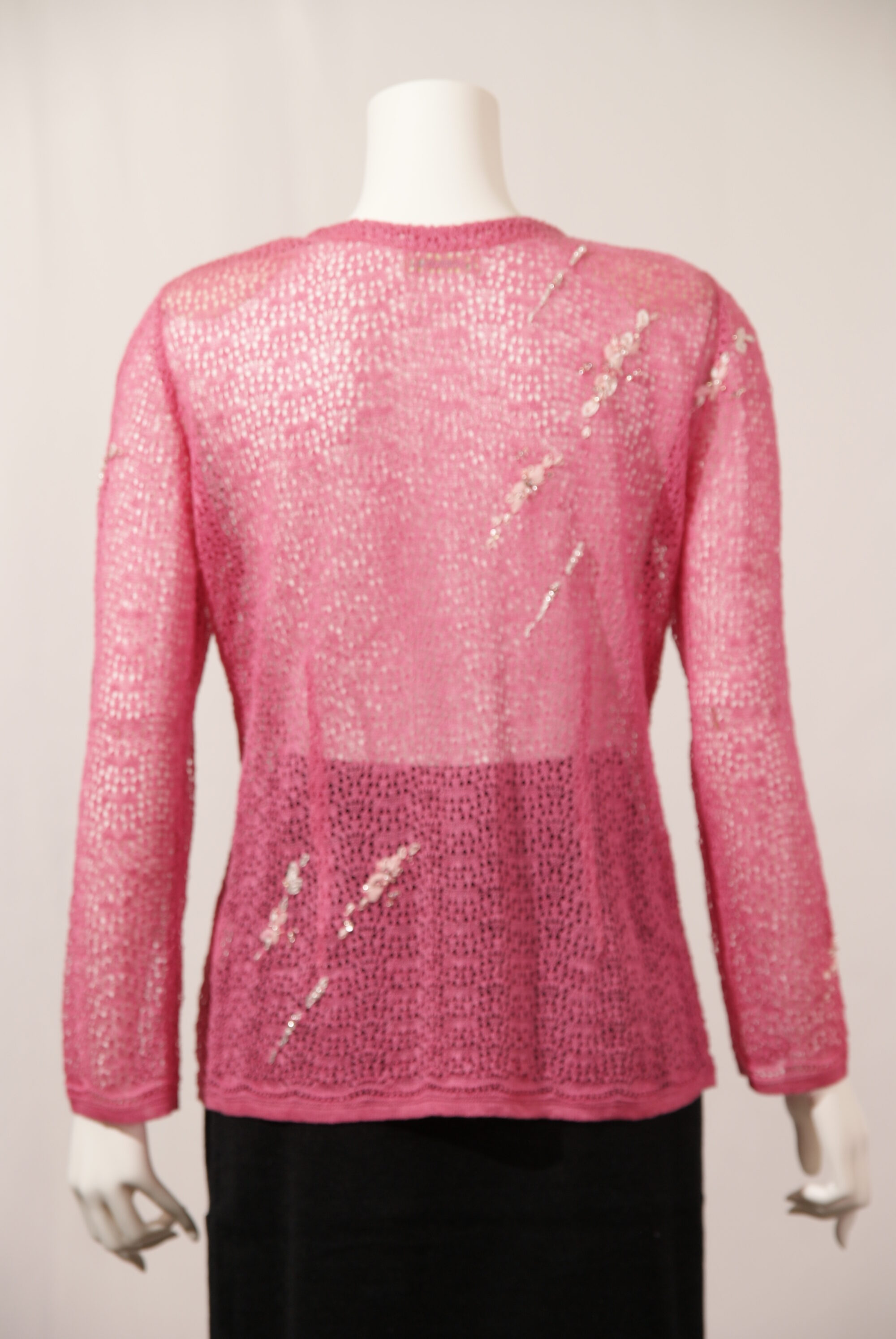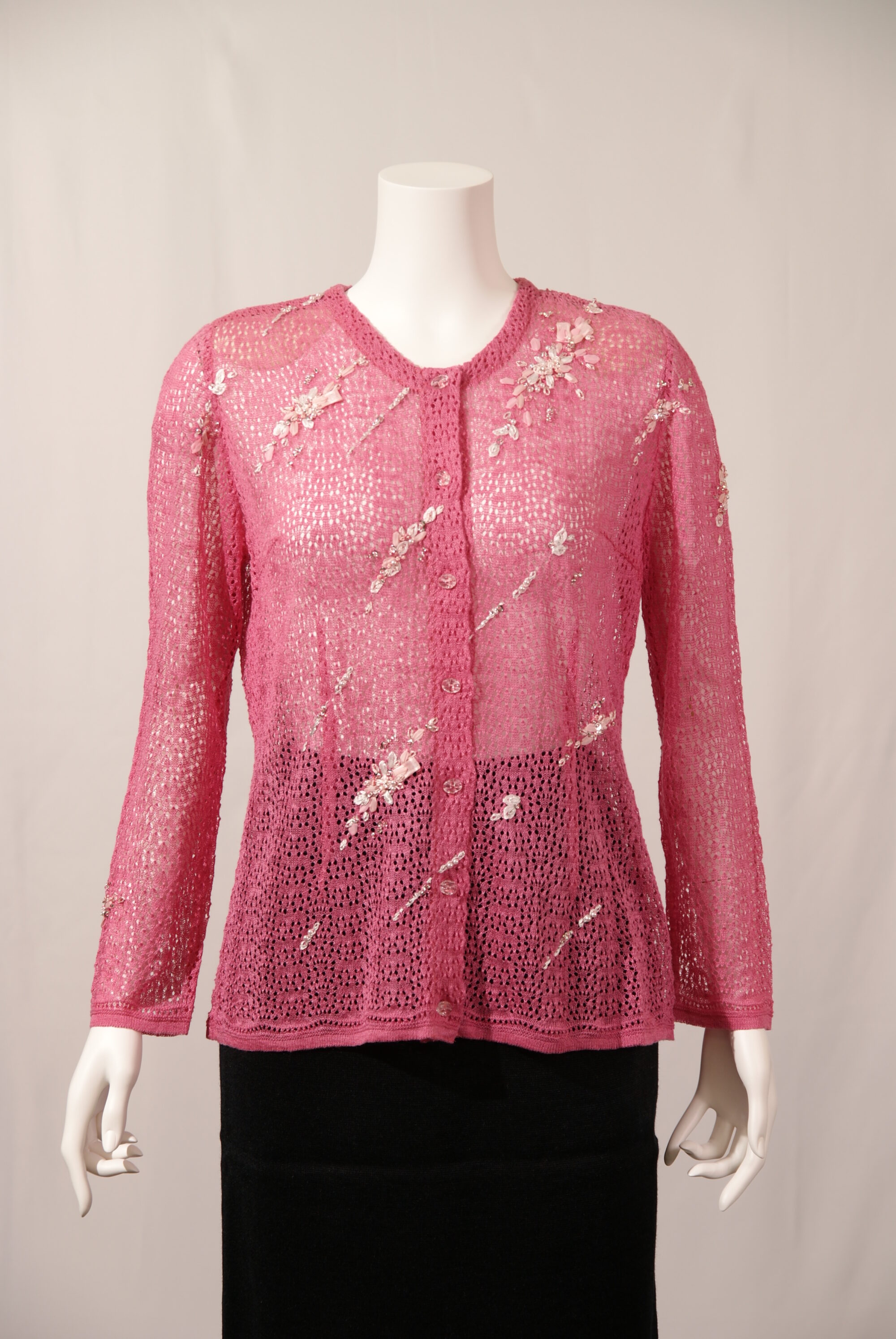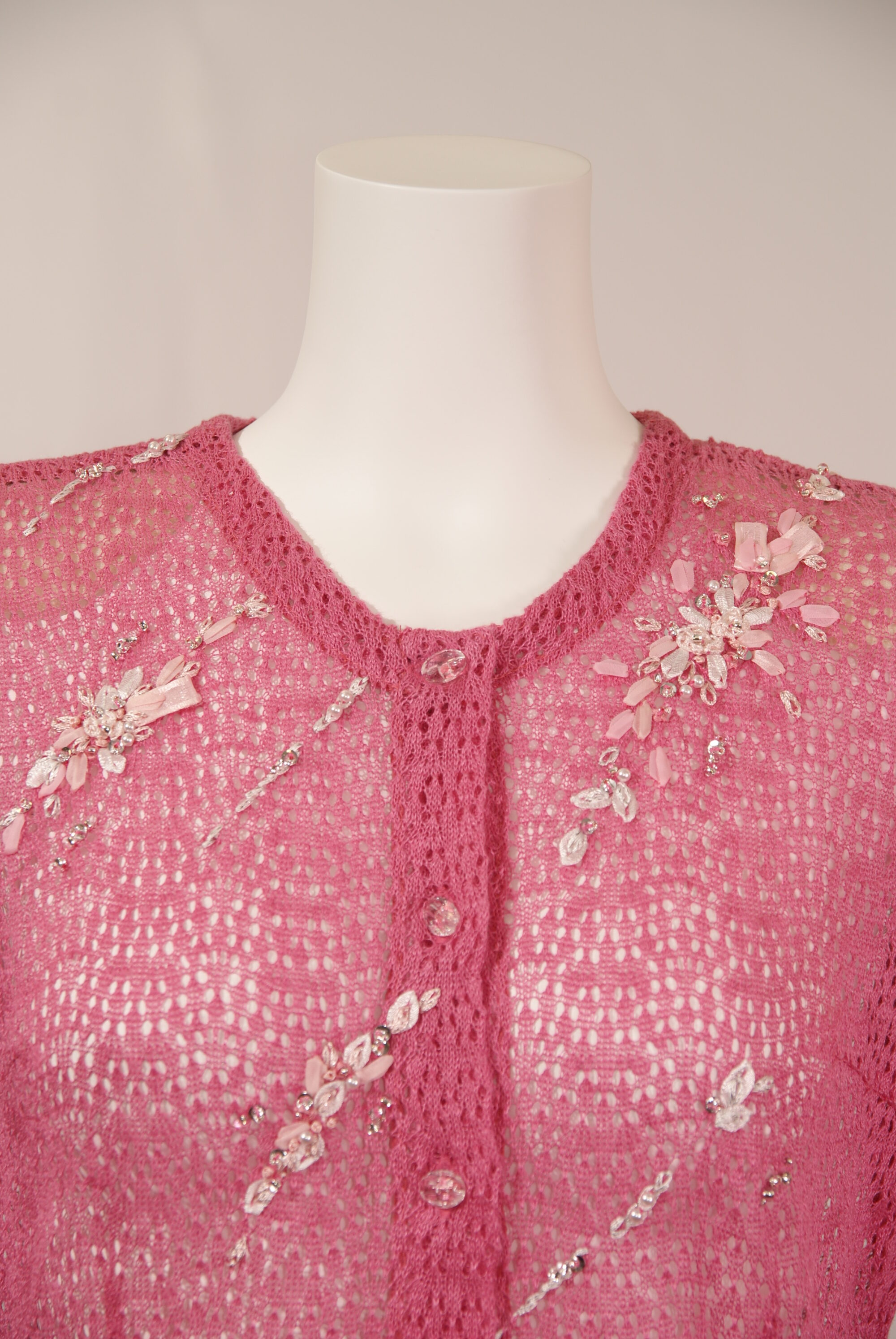 高級天然素材のリネン麻を使用したニットカーディガンです。サガンオリジナルの繊細なスカシ柄にかぎ針の花モチーフやビーズを使用した繊細な刺繍が星の様に流れる上品な一着です。(#120120とセットアップ可能)