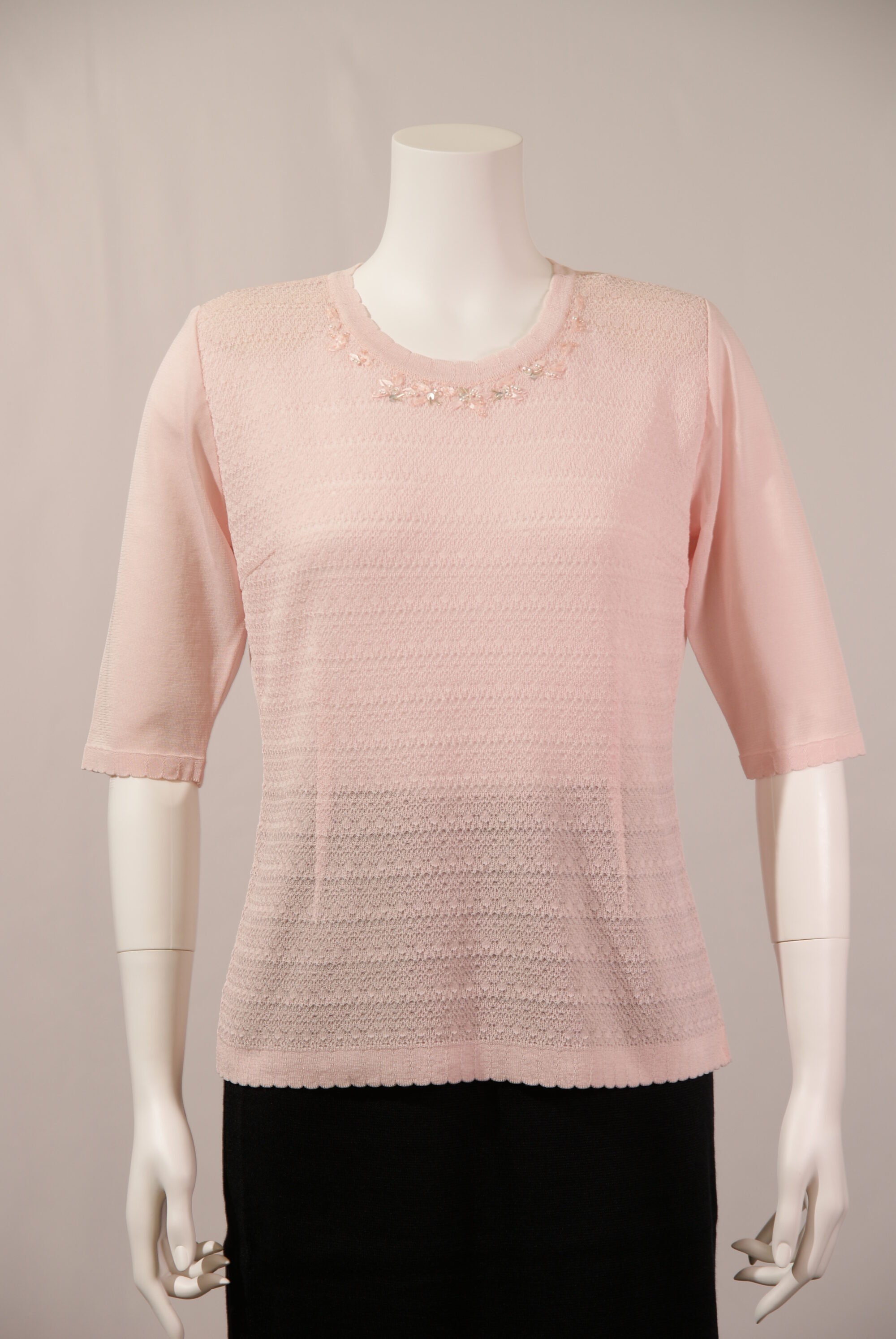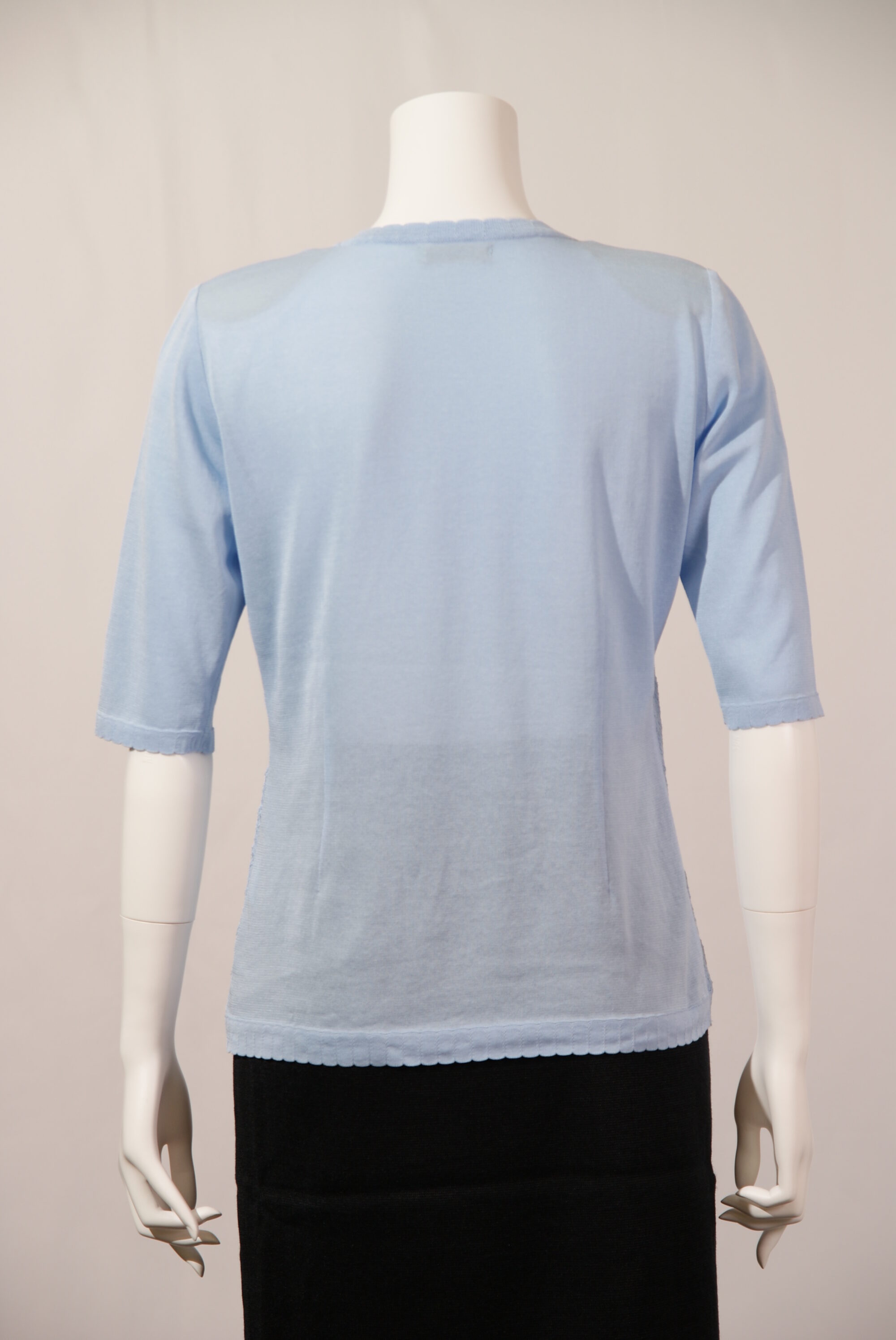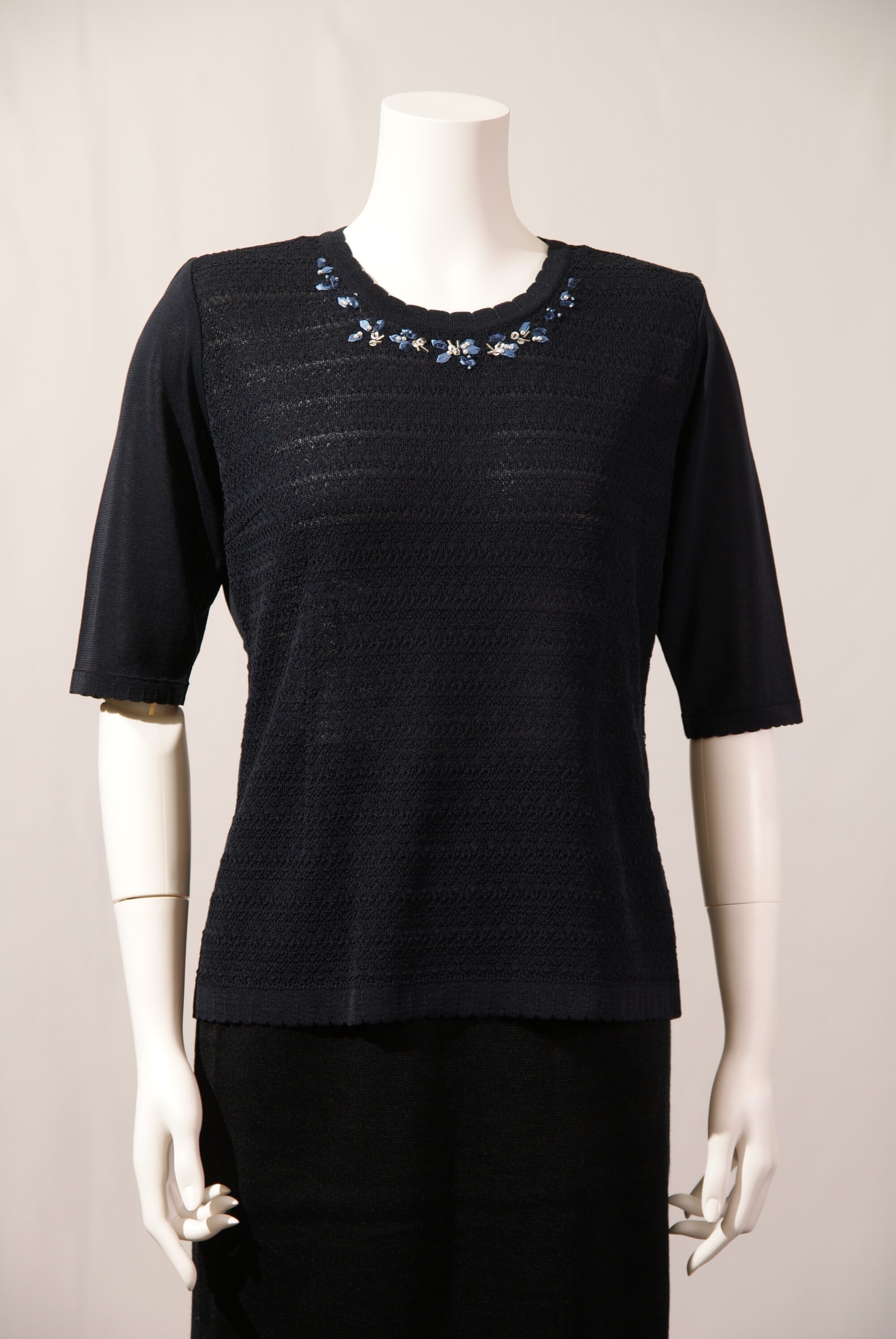綿混素材を使用したニットセーターはさらっとして夏場までお使いいただけます。繊細なレース編みの前身頃、衿まわりのリボン刺繍が女性らしさを引き立てる上品なデザインです。(#210404とアンサンブル可能)