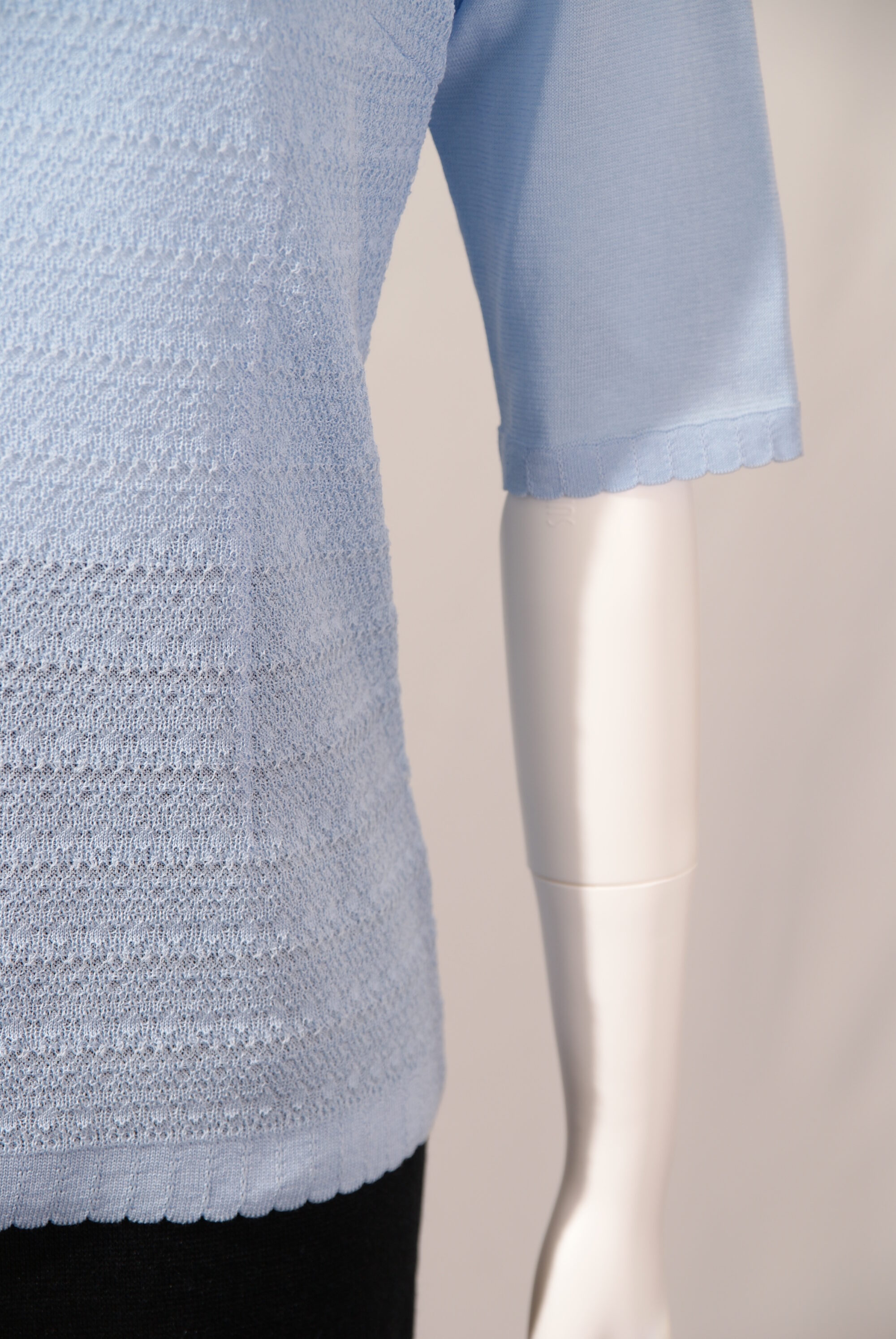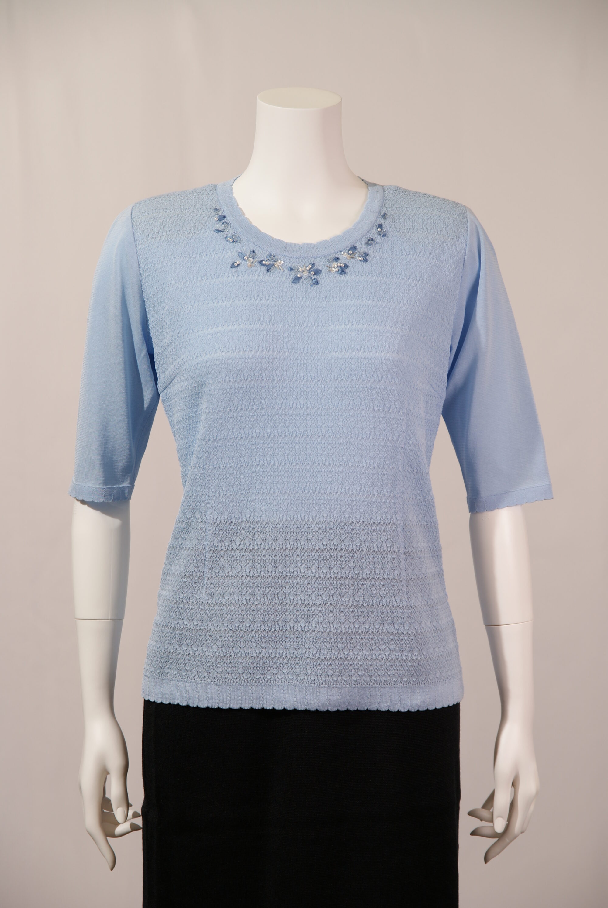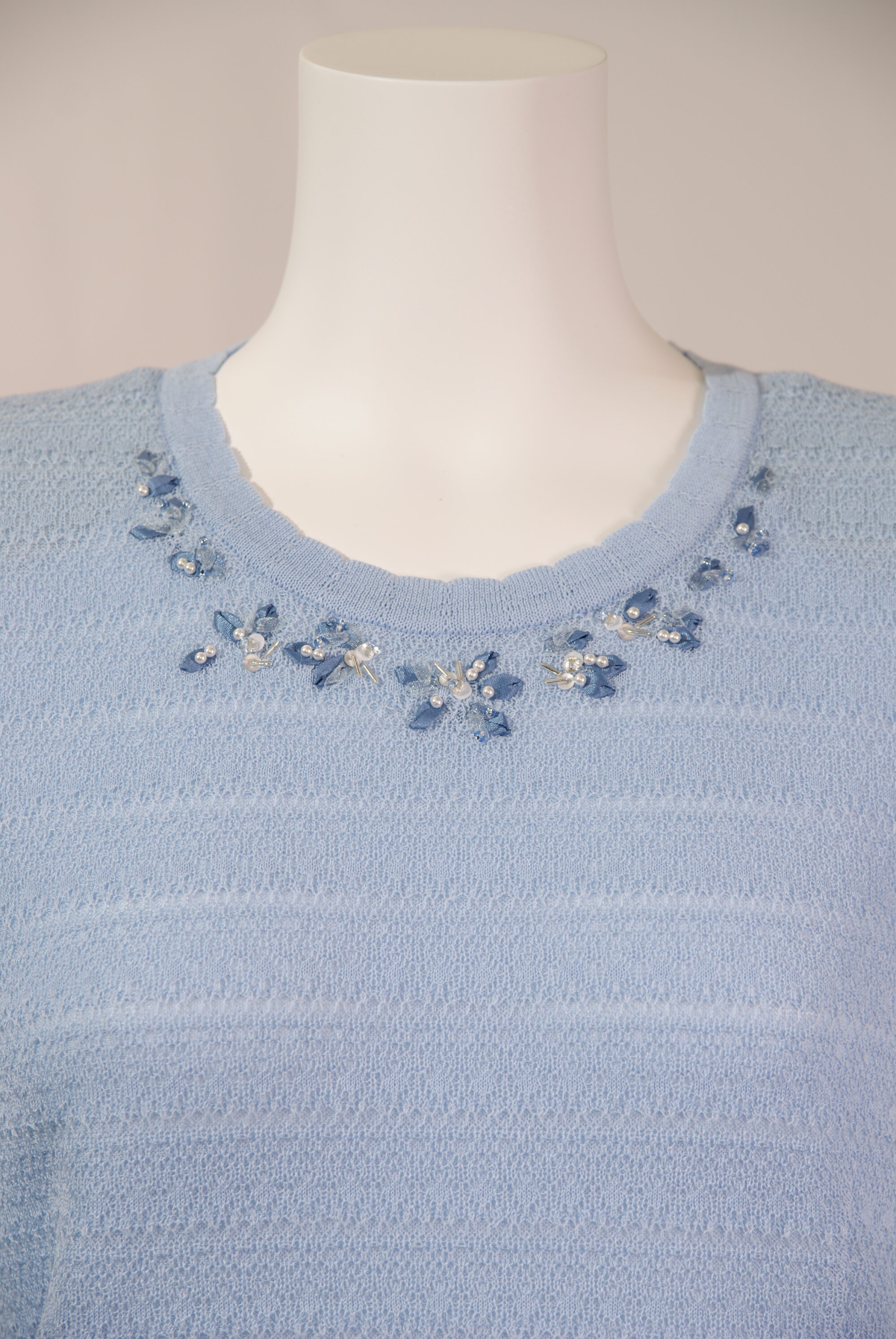 綿混素材を使用したニットセーターはさらっとして夏場までお使いいただけます。繊細なレース編みの前身頃、衿まわりのリボン刺繍が女性らしさを引き立てる上品なデザインです。(#210404とアンサンブル可能)