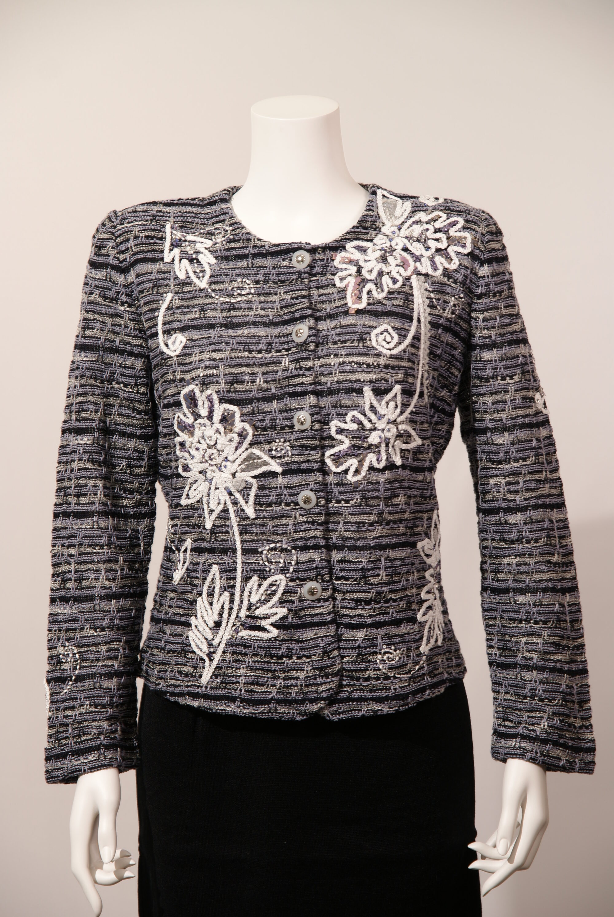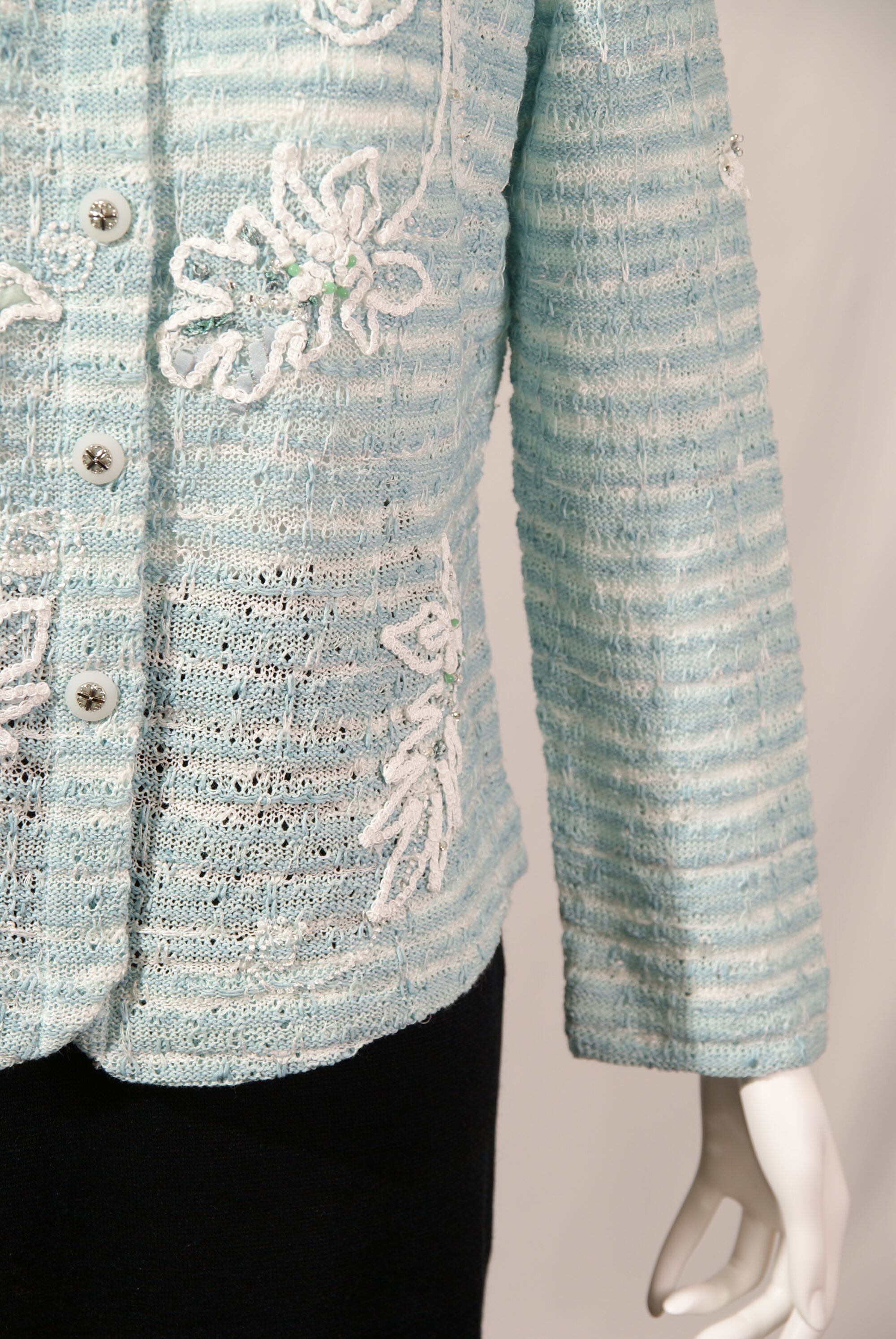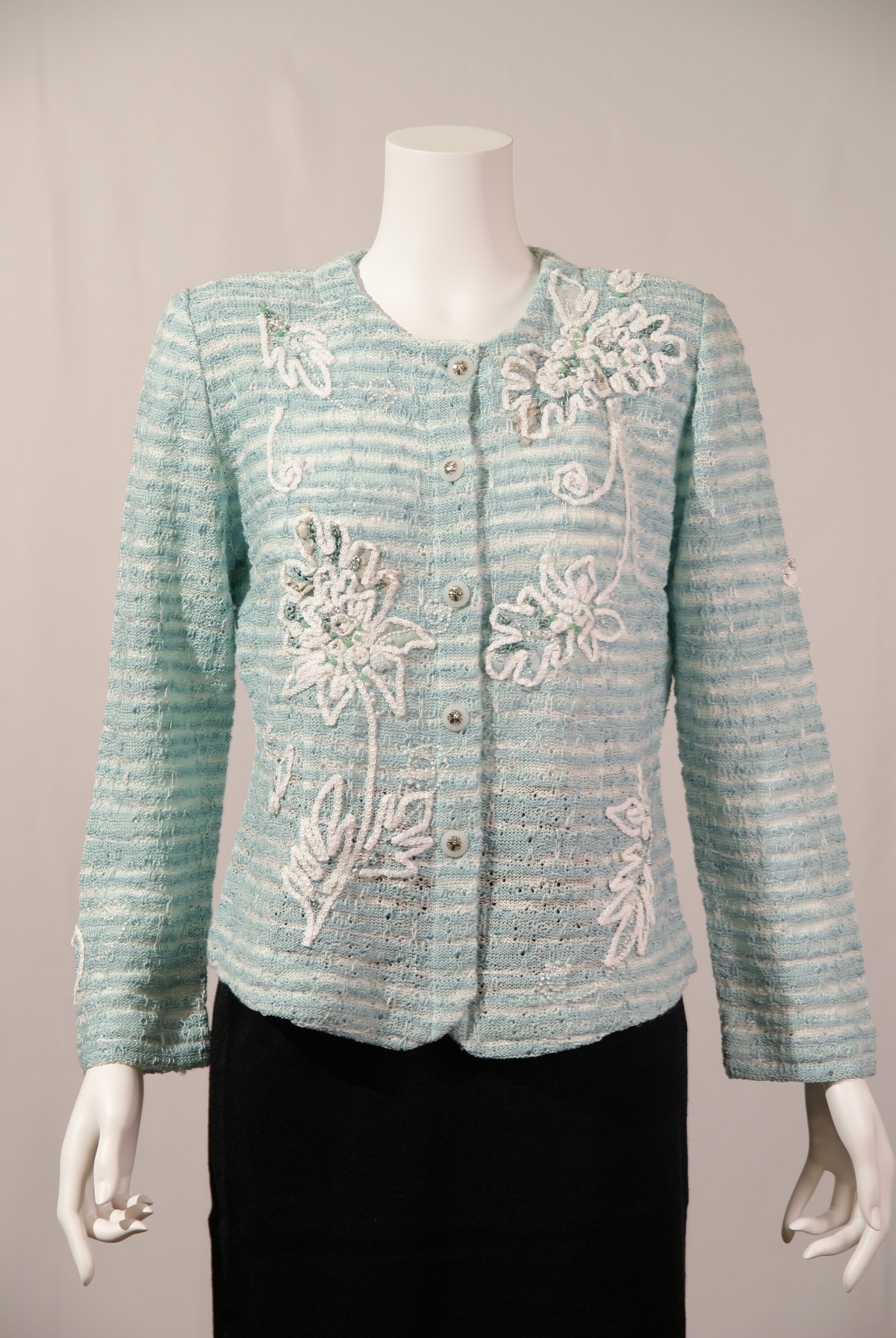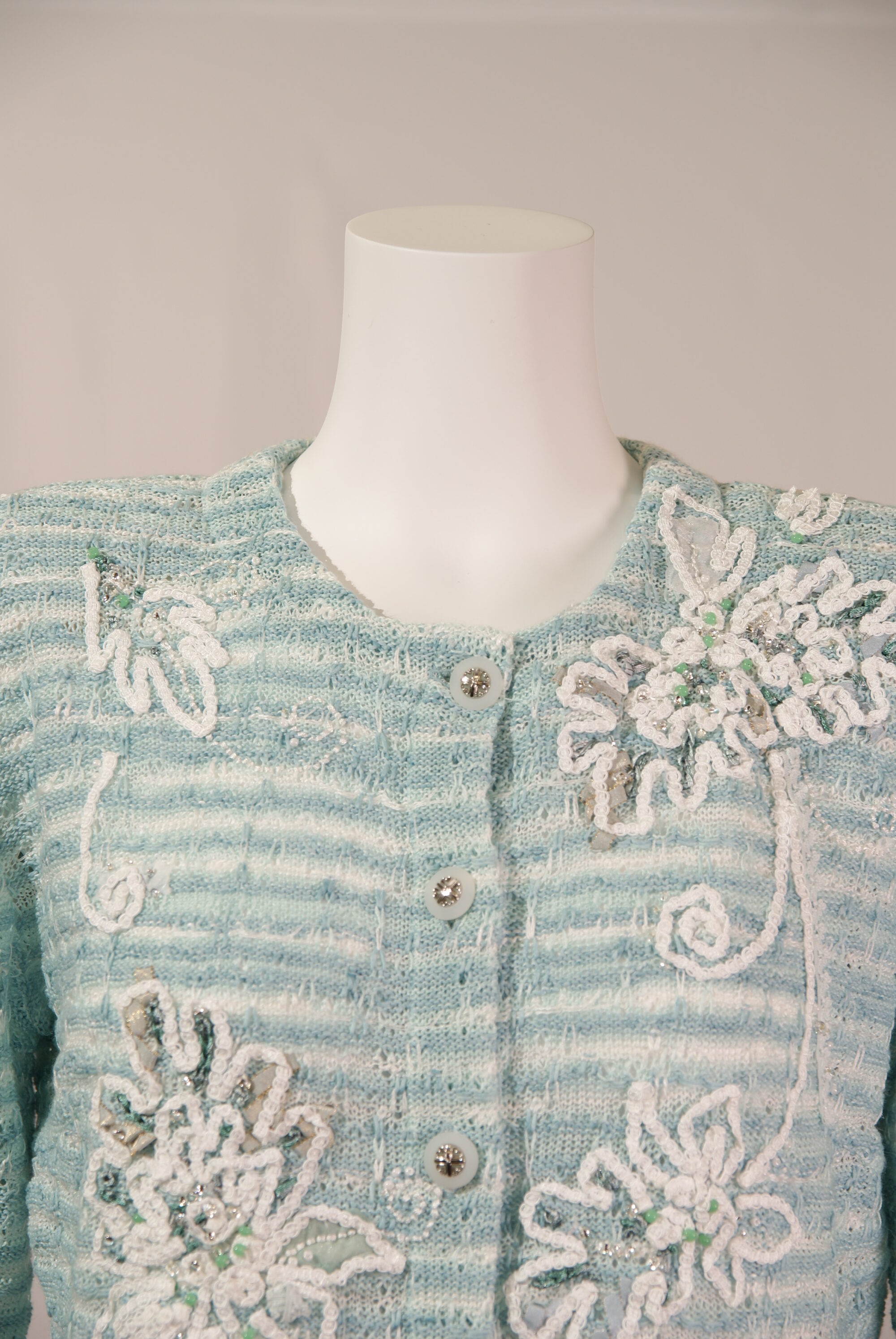 清涼感のある麻に加え3種類の糸で編み込まれた、アトリエサガンオリジナルのニットジャケットです。花びら部分を複雑に表現したコード刺繍を施しました。アトリエサガンのマークであるクローバーのボタンもポイントになっています。