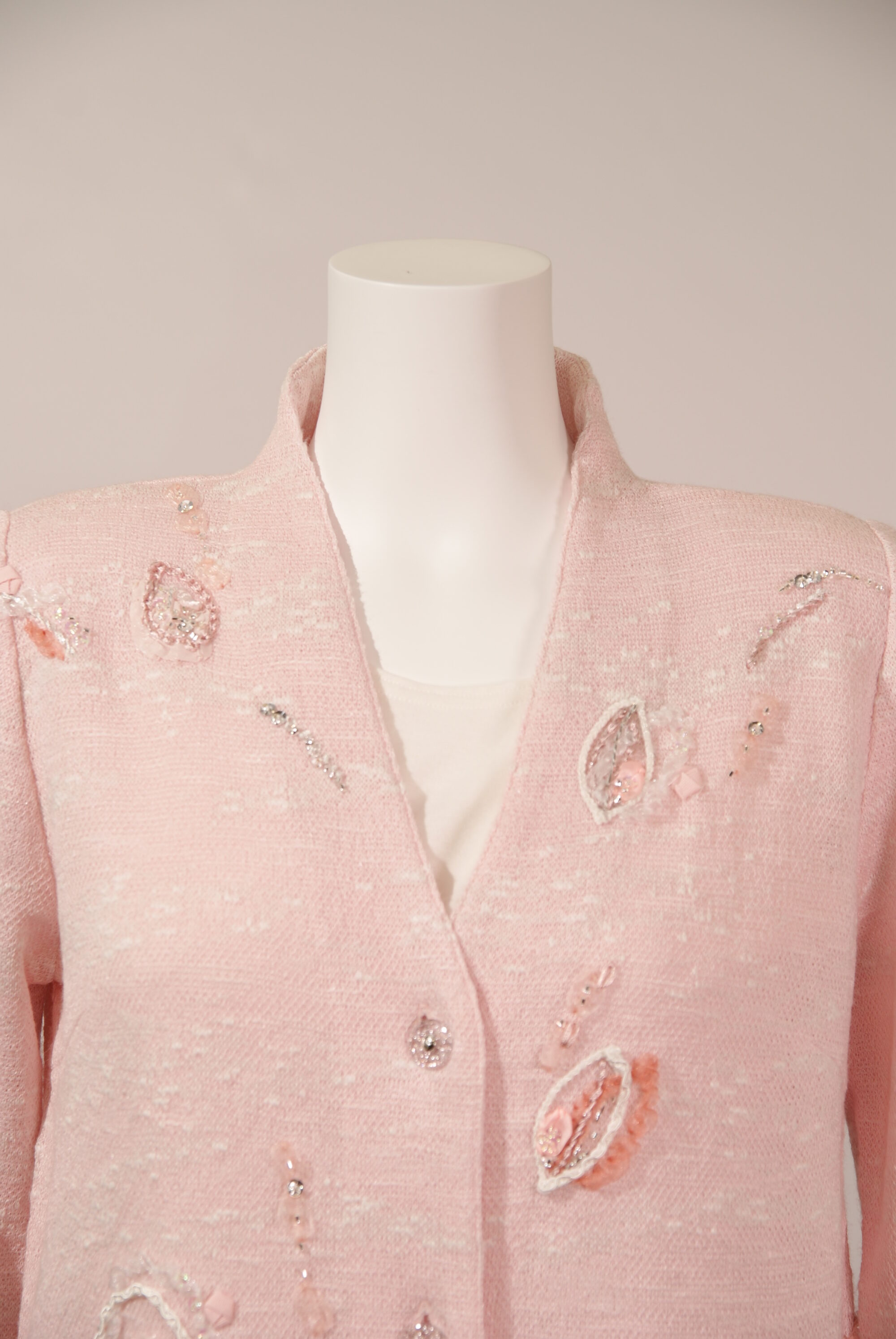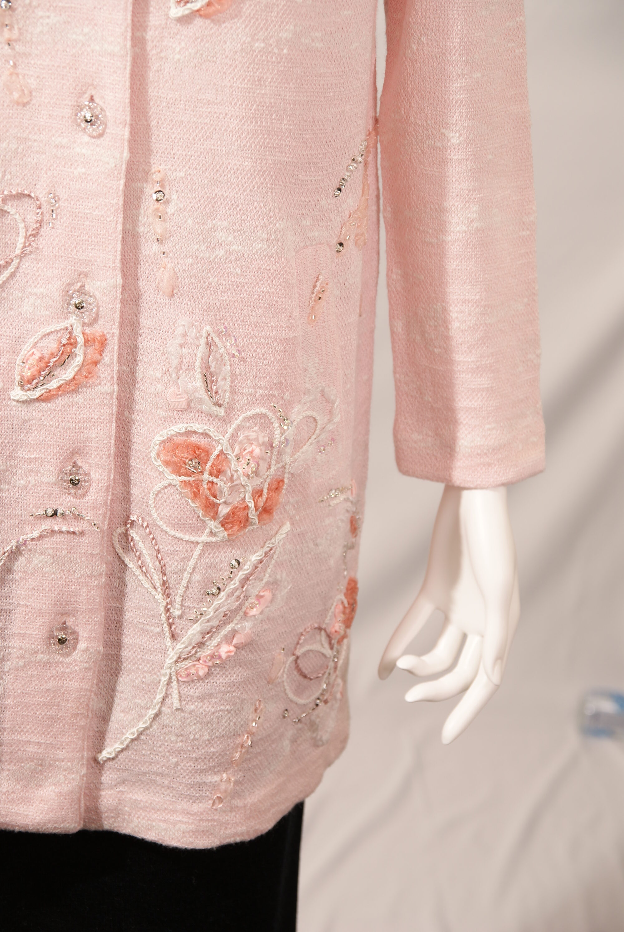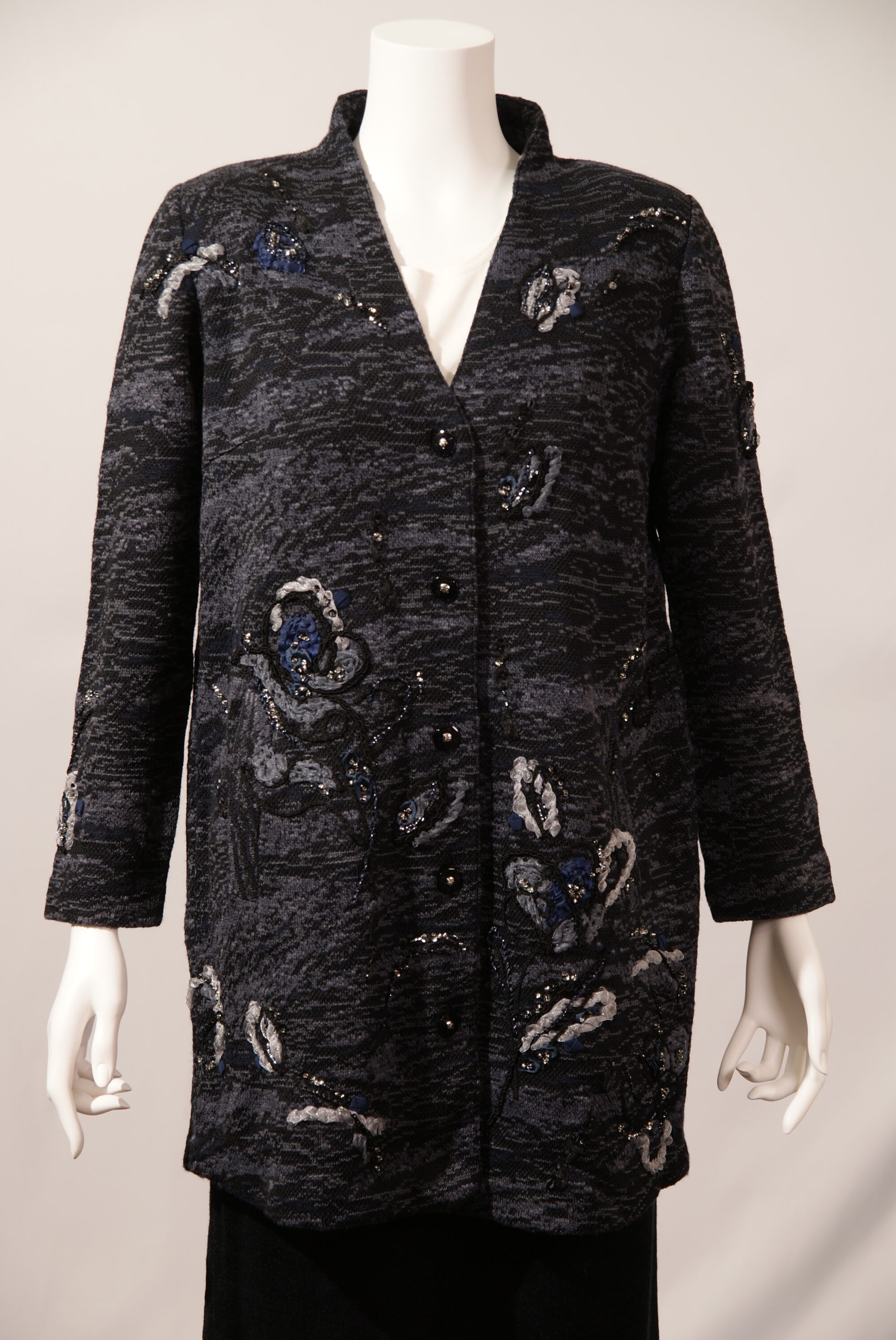 清涼感のある麻をベースに4種類の糸を複雑に編み込んだ、サガンオリジナルのニットスプリングコートです。水面から着想した有機的なデザインの編地に花を抽象的に表現した刺繡をあしらったモダンな一着です。